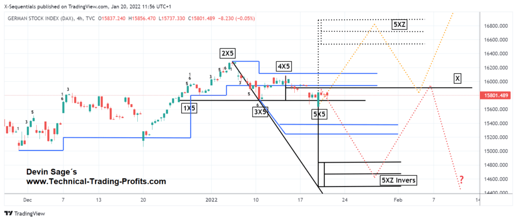 Der DAX Index notiert am Donnerstag, den 20.1.2022 bei 15816.669 Punkten. Im obigen 4h Chart ist zu sehen, dass der DAX Index ein potenzielles, bullishes X-Sequentials X5 Muster ausgebildet hat. So lange das gestrige Tief bei 15629.860 Punkten nicht unterboten wird, solange ist eine Kursanstieg bis 16545 Punkten – 16710 Punkten – 16885 Punkten zu erwarten (orange gestricheltes Szenario). Anschließende Unterstützung befindet sich an der X-Sequentials „X“ Marke bei 15910 Punkten. Generell müssen für einen Kursanstieg die 4h Schlusskurse oberhalb der 3/6 X-Sequentials Abwärtstrendmarke bei 16116.219 Punkten notieren. An dieser Marke kann Widerstand gefunden werden. Unterbietet der DAX Index jedoch die Marke von 15629.860 Punkten, dann ist ein Kursrückgang bis in die Abwärtszielzone bei 14835 Punkten bis 14680 Punkten bis 14487 Punkten zu erwarten (in rot skizziertes Szenario). Anschließender Widerstand befindet sich an der X-Sequentials „X“ Marke bei 15910 Punkten. Ein Zwischenziel in Abwärtsrichtung befindet sich bei 15375 Punkten bis 15245 Punkten. So lange eine plötzliche Kursstärke ausbleibt, solange spricht derzeit alles für tiefere Kurse und der DAX Index hätte ein Doppeltop ausgebildet.