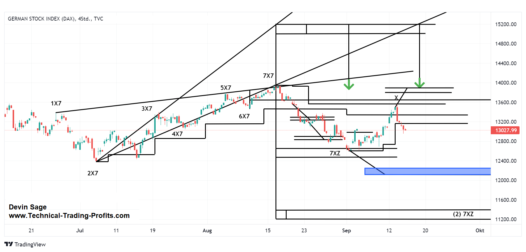 Seit dem letzten Update 6.9.2022 notierte der DAX-Index, ausgehend von einem Schlusskurs von 12871.45 Punkten, nicht bis in die X-Sequentials Kurszielzone bei 12255 Punkten bis 12110 Punkten tiefer, sodass ein weiterer Kursverfall ausblieb. Es wurde die Prognose eines Kursanstiegs bis in den Kursbereich der X-Sequentials „X“ Marke des vorliegenden X-Sequentials X7 Musters bei 13455.70 Punkten bis 13650 Punkten erfüllt. Der Hochpunkt lag am 13.9.2022 bei 13564.83 Punkten. Der DAX-Index fiel im Anschluss bis 12952.09 Punkten. Der Schlusskurs am Mittwoch, den 14.9.2022 lag bei 13027.99 Punkten.
